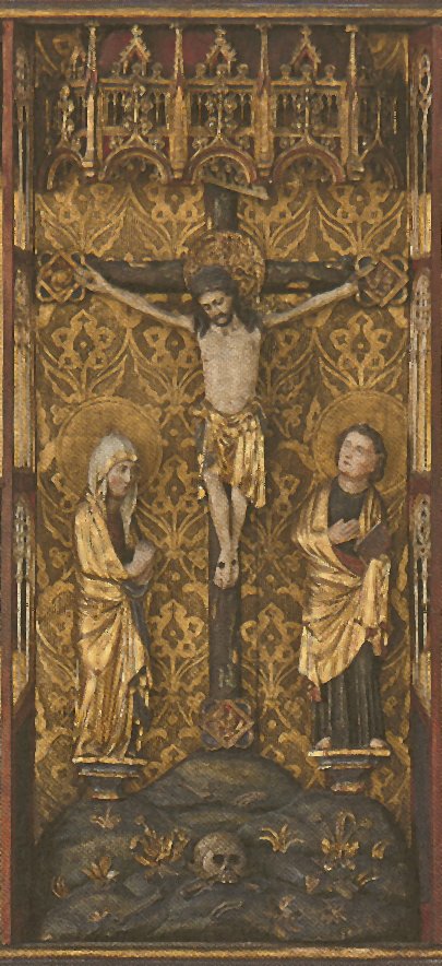 Centraal in het schrijn staat de gekruisigde Jezus, geflankeerd door Maria en Johannes de Evangelist. Het 131 cm hoge kruis staat op de heuvel Golgotha. Uit koolstofdatering is gebleken dat kruis en Jezus rond 1300 zijn vervaardigd en dus ouder zijn dan de overige delen van het retabel. Er is dus een reeds bestaand crucifix gebruikt.