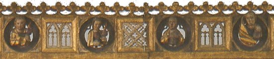 De predella, het voetstuk, bevat twaalf beelden: zes kerkvaders, twee heiligen, een pseudo-apostel (Dionysius), Maria, de Engel en Johannes de Doper. Van links naar rechts op de afbeelding hierboven: Augustinus, Hieronymus, Gregorius, de engel, Maria, Johannes, Dionysius Areopagita, en Chrysostomus. Niet op de afbeelding: uiterst links Origines en Ambrosius, uiterst rechts de heiligen Bernardus en Benedictus.